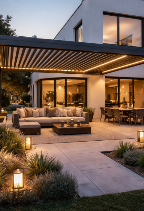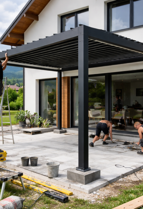 Pogost scenarij je novogradnja z velikimi drsnimi stenami na jug ali zahod. Tu pergola ni le udobje, temveč zaščita pred pregrevanjem. Aluminijaste bioklimatske pergole z lamelami omogočajo regulacijo svetlobe in prezračevanja, kar zmanjša potrebo po notranjem hlajenju, čeprav točnega prihranka brez izračuna ni korektno obljubljati. Vendar se v bivalni praksi razlika občuti, ker se prostor manj segreje in so rolete ali screeni manj obremenjeni.