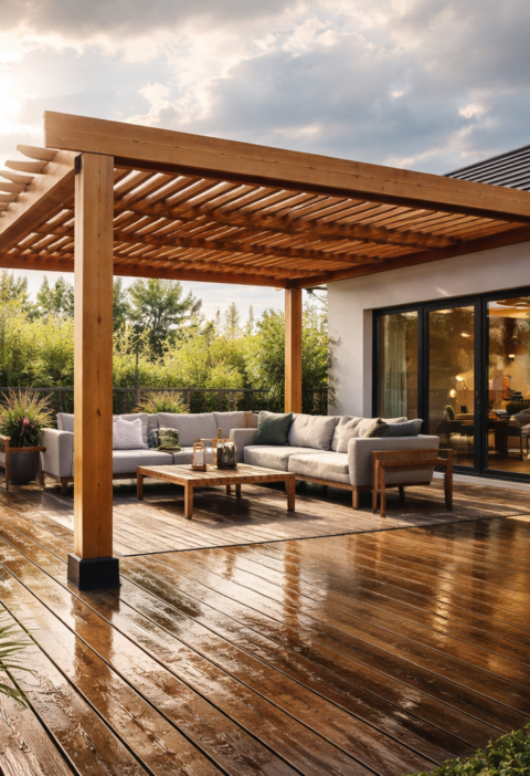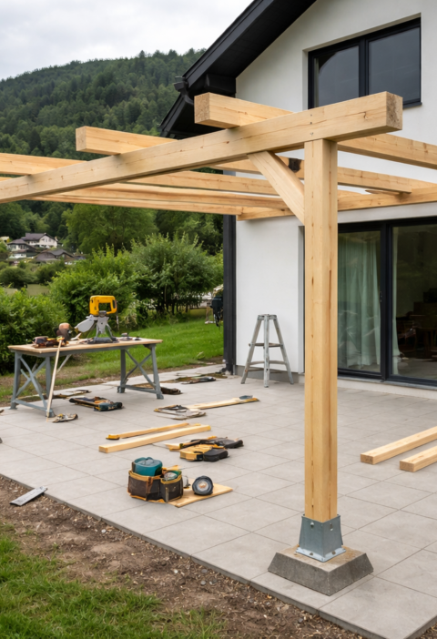 Les je material, ki na terasi deluje toplo in arhitekturno mehko. Pri novogradnjah in prenovah, kjer se želi naraven stik z vrtom, je to pogosto odločilno. Težava je, da les na prostem nikoli ne miruje. Dela, poka, zvija se in spreminja dimenzije z vlago. To pomeni, da je konstrukcija lesene pergole odvisna od pravilnega izbora lesa, vlage ob vgradnji, zaščite čelnih rezov in predvsem od detajlov stikov.