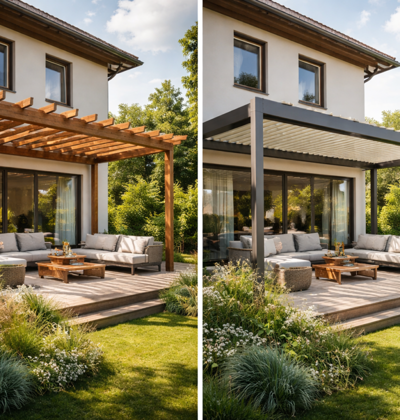 Trg senčil in nadstreškov je v zadnjih sezonah eksplodiral, z njim pa tudi napačne odločitve. Pergola je danes več kot le senca nad mizo. Postane podaljšek dnevne sobe, varovalo pred pregrevanjem stekla, zaščita fasade pred nalivi in pogosto tudi nosilec LED osvetlitve, screen rolojev ali zasteklitve. Zato ima izbira materiala posledice, ki se pokažejo šele skozi letne čase. Lesena ali aluminijasta pergola primerjava 2026 je smiselna predvsem zato, ker se pričakovanja kupcev dvigujejo, vremenski ekstremi pa niso več izjema.